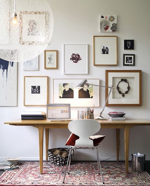 - Tip: Playful and grounded are two words to keep in mind when thinking about your wall. Play with different sizes, shapes, textures, etc. You will want there to be at least one aspect or feeling that all of your pieces share that keep the wall grounded...i.e. color palate, frame size, subject matter etc. Again, don't be too restricted by this...have fun.