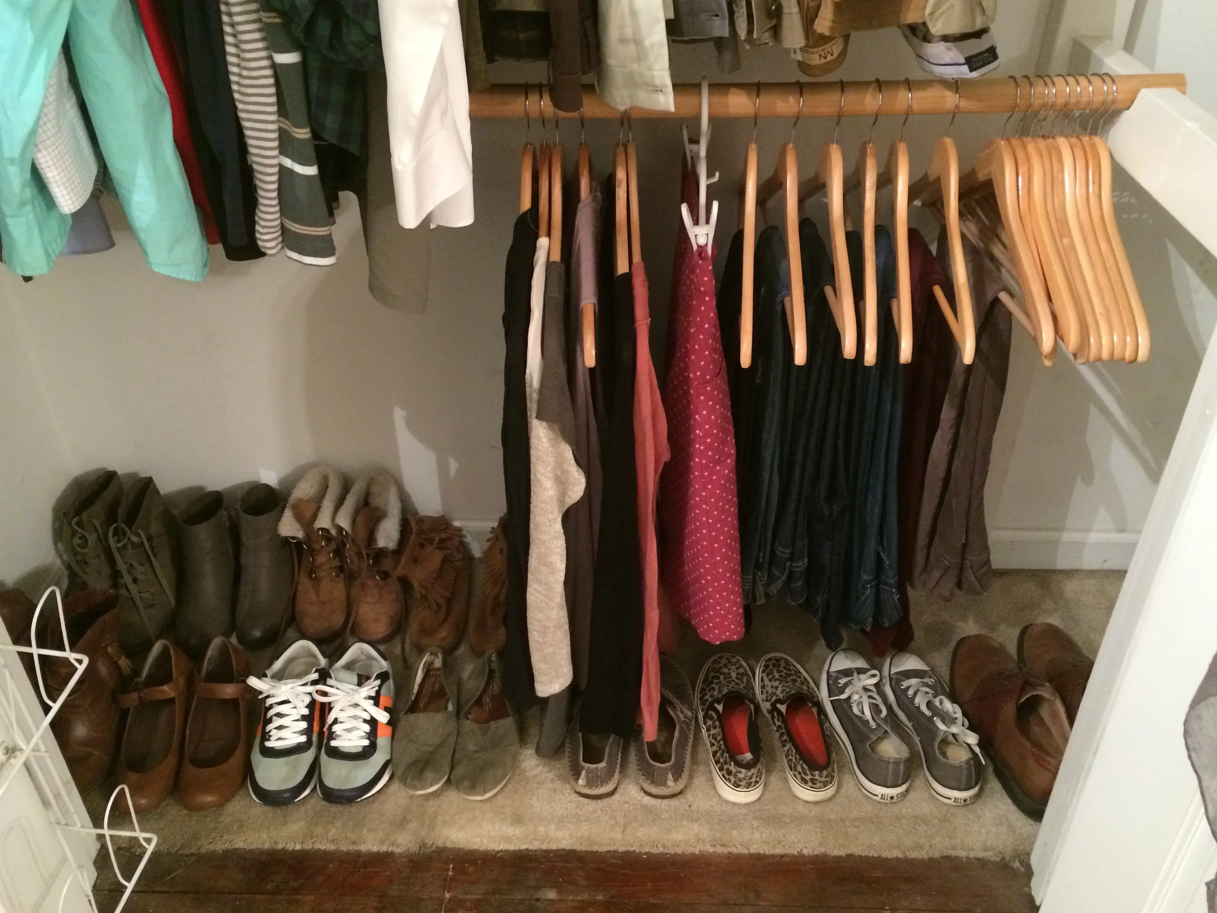 3 sweaters, 14 shirts, 1 vest, 2 pairs of corduroys, 1 pair of black pants, 5 pairs of jeans, 2 pairs of booties, 3 pairs of boots, and 8 pairs of other shoes. (Self diagnosed shoe addict over here)