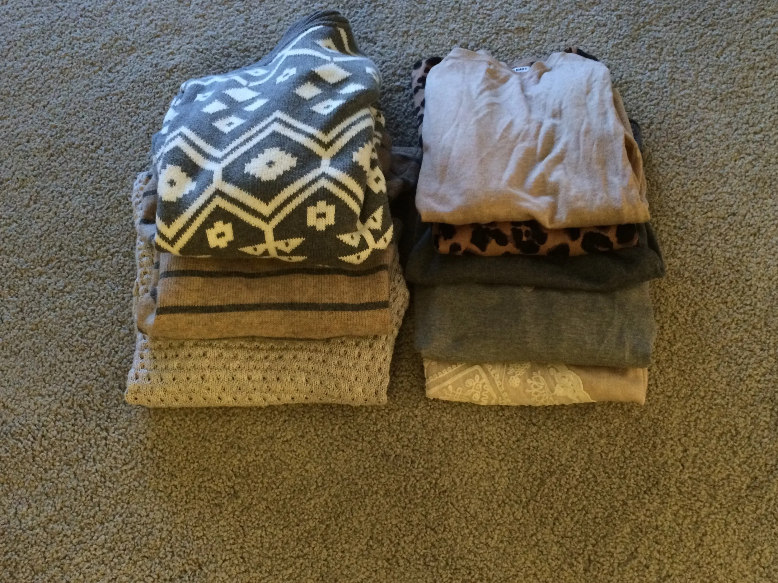 2 pairs of Jeans, I pair of black jeggings (I'm kind of embarrassed that I have these but they are so comfortable), 9 shirts, 2 sweaters, and 2 pairs of shoes (that look terrible but I still love to wear them)