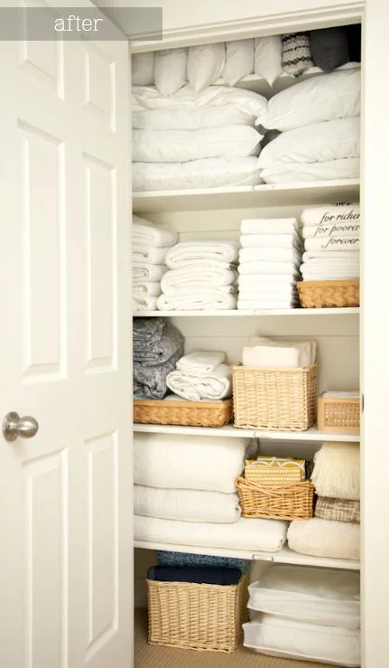 - Occasional Use- the towels, sheets and blankets you only need when you have multiple house guests at one time or when the whole family goes on a trip. These could be better stored under a bed in a vacuum seal bag. Table cloths might fall into this category- try to find a place closer to the kitchen such as the top shelf of the pantry.