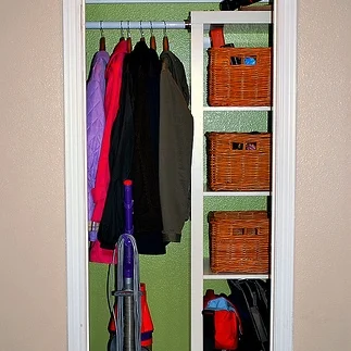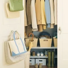 Sort into categories. Discard: don't be ashamed if you find a few things that should be thrown away. Donate: old jackets, hats and scarves that you won't wear this year. Relocate: the jackets that should go into individuals closets, items that belong in the garage, anything that might be more useful to have in the laundry room. Keep: the jackets, umbrellas, hats and boots that make the most sense in this closet for you and your family.